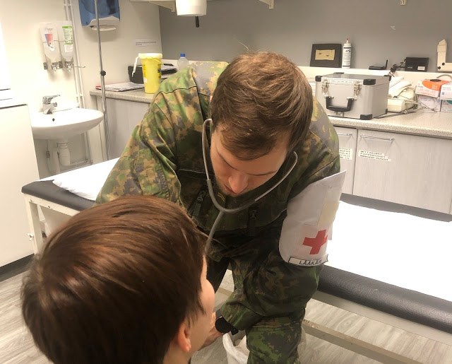 Tämän harjoituksen lääkintähuolto muodostuu kahdesta viikoittain vaihtuvasta kenttäsairaanhoitajasta. Me olemme harjoituksessa mukana 11.-18.1.2020. Olemme ensimmäistä kertaa virkaurallamme Maanpuolustuskorkeakoulun ampumaharjoituksessa. Vaikka Kainuun prikaatin harjoituksista on jo kokemuksia useamman vuoden ajalta, tunne oli hieman jännittynyt harjoitukseen lähtöaamuna, koska henkilöstö ja toimintamallit olivat hieman erilaiset verrattuna totuttuihin. Alkujännitys osoittautui kuitenkin turhaksi, koska yhteistyö harjoituksen henkilöstön kanssa on sujunut hyvin ja luontevasti. Tehtävämme tässä harjoituksessa on huolehtia sairastuneiden vastaanoton pitämisestä, ammuntojen lääkinnällisestä varotoiminnasta sekä lääkintämiesten kouluttamisesta.