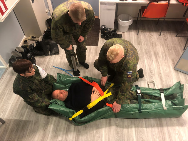 Varomääräys D7.7 määrää ammuntojen lääkinnällistä varotoimintaa. Ammunnoissa tulee olla nimettynä ensiapuhenkilö, joina tässä harjoituksessa pääasiassa toimivat lääkintämiehet ja lääkintäaliupseeri. Osassa ammunnoista ensiapuhenkilöillä oli käytössään ahkio, jonka käyttöä harjoittelimme ennen ensimmäistä ammuntapäivää leirisairaalan lähimaastossa. Alla olevassa kuvassa suoritetaan (kuvaus)potilaan siirtoa ahkioon, potilaan ollessa jo hypotermiapussissa ja vetoalustaan kiinnitettynä. Näiden välineiden käyttö tulee olla myös lääkintämiehillä hallinnassa.